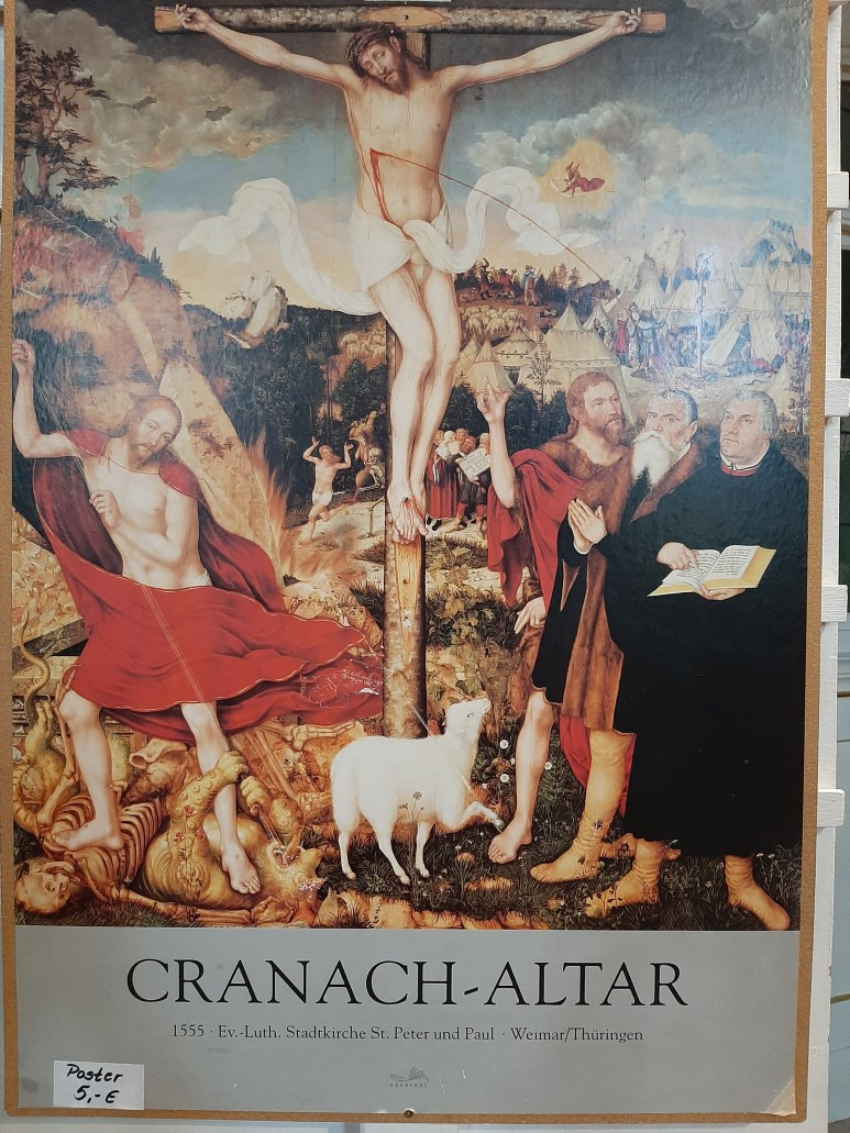 바이마르 헤르더 교회 교회 안 강대상 뒤 성화에는 십자가 아래 세례 요한과 마르틴 루터가 성경(아마도 로마서 1장)을 펴고 십자가를 바라보는 장면이 그려져 있다.